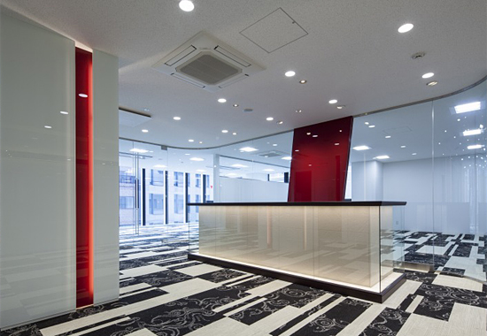 クーリアの新たなコーポ-レートカラーである黒・赤・白を基調としたモダンなインテリア・デザインの5階は、受付、内務フロアとなっています。東側には全面ガラス窓からの自然光が明るい、ショールームを設置しています。
